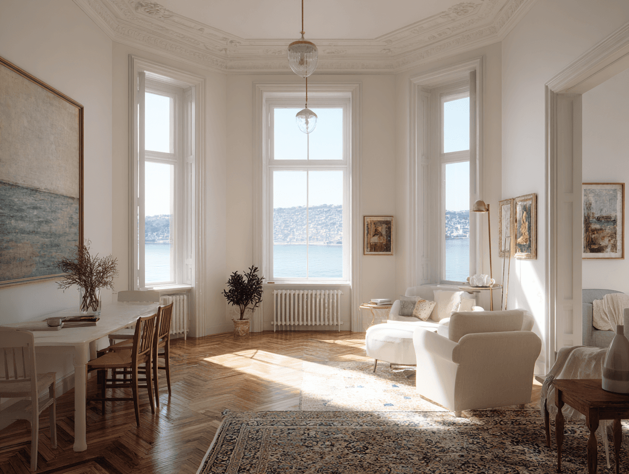 Akra’s team aimed to restore the apartment’s historical identity while introducing modern functionality. The focus was on making the Bosphorus view the central feature of the home and creating a seamless flow between living areas.